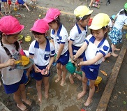 広い砂場で水遊び